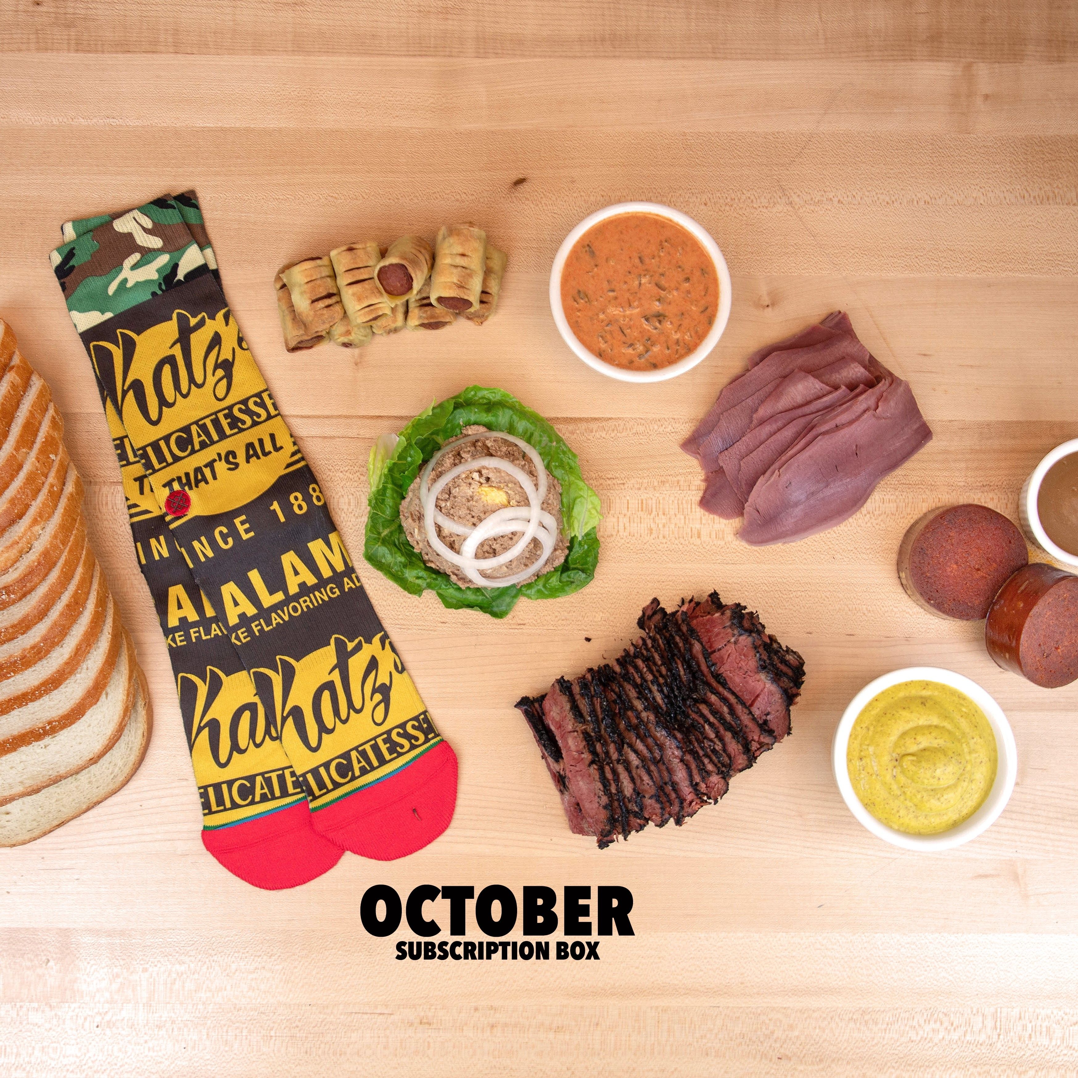 October is time to take a walk on the wild side and enjoy some spooky delicacies! It takes some guts to make our kishka (stuffed derma) and chopped liver, but even the faint of heart will enjoy our version of these Jewish classics! We’ve tossed in some of our legendary pastrami and pigs in a blanket for the more conservative eaters in your family, and some limited-edition salami socks. This package includes: